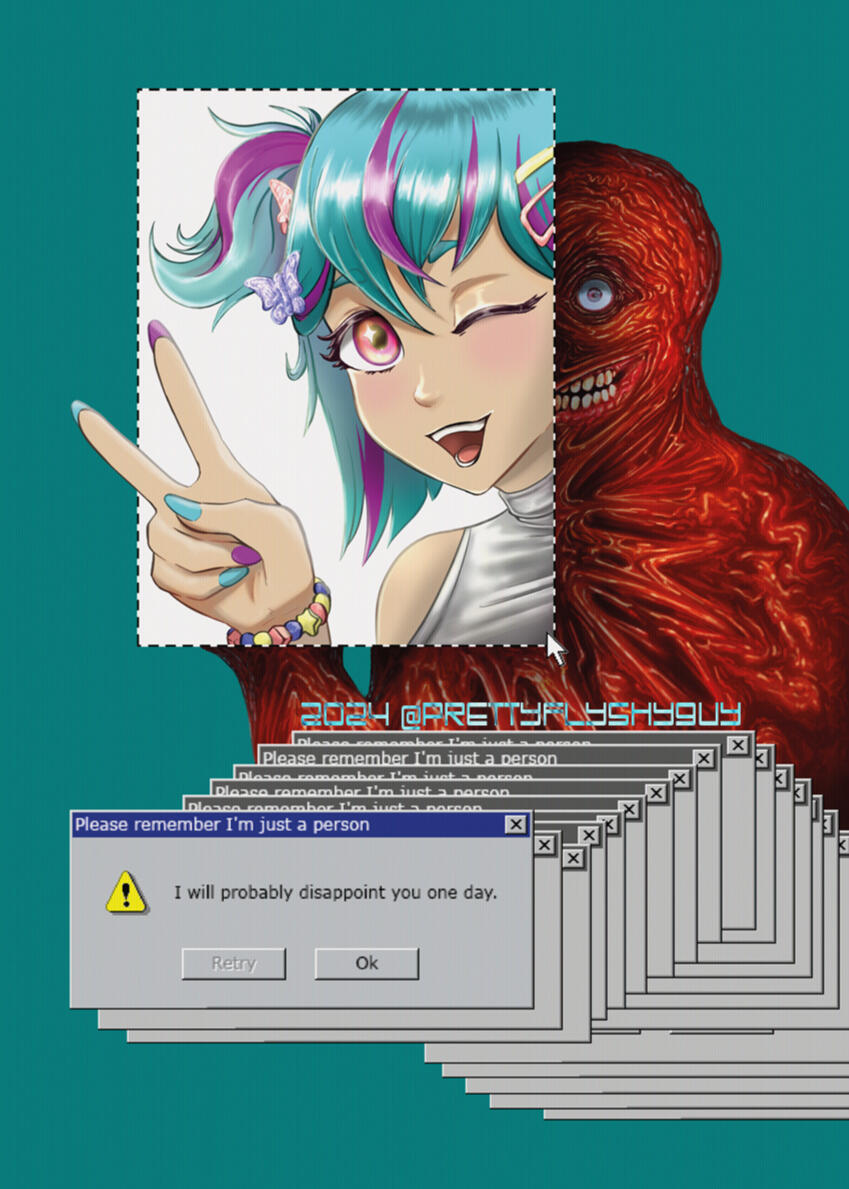 Hi I'm Shy!I'm a Melbourne based artist and designer.Whether it's the kitsch and excessive sparkles of the Y2K era, or a spooky monster peering around the corner of a decrepit abandoned science facility, my work will always have you daring to look twice. Forever stuck in the age of the early internet, torn between the joys of childhood nostalgia and the eternal horrors lurking behind a glowing screen.Don't worry about it.